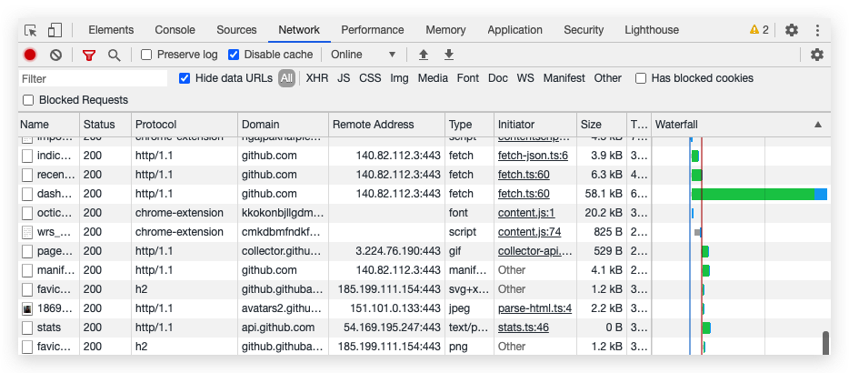 敲黑板 如果细心的话,你会发现,Waterfall 这一栏下,蓝色的线代表的是DOM 加载完毕的节点,而红色的线代表的是 load 脚本执行结束的节点。