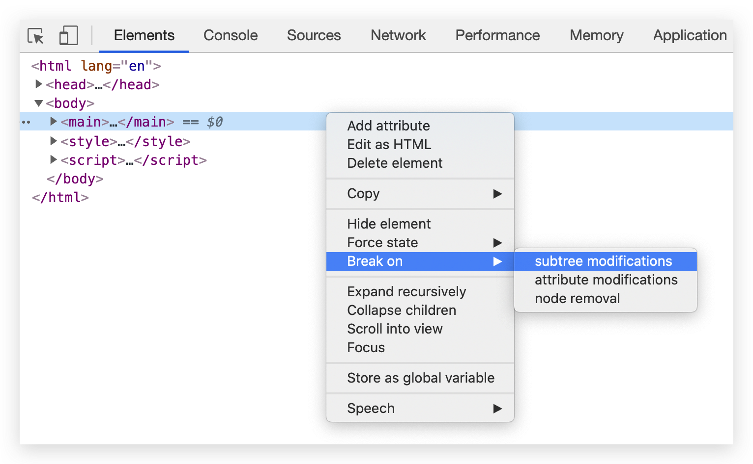 这样的情况下,你就可以添加一个 DOM 断点:监听节点被添加或者移除 / 属性被改变。