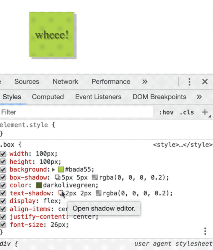 听起来很不吉利(译者注:阴影哪里不吉利了!),但是它也只是一个小部件而已。你可以通过在 Style 面板中点击靠近 box-shadow 属性或者 text-shadow 属性的 阴影方形符号 来打开它: