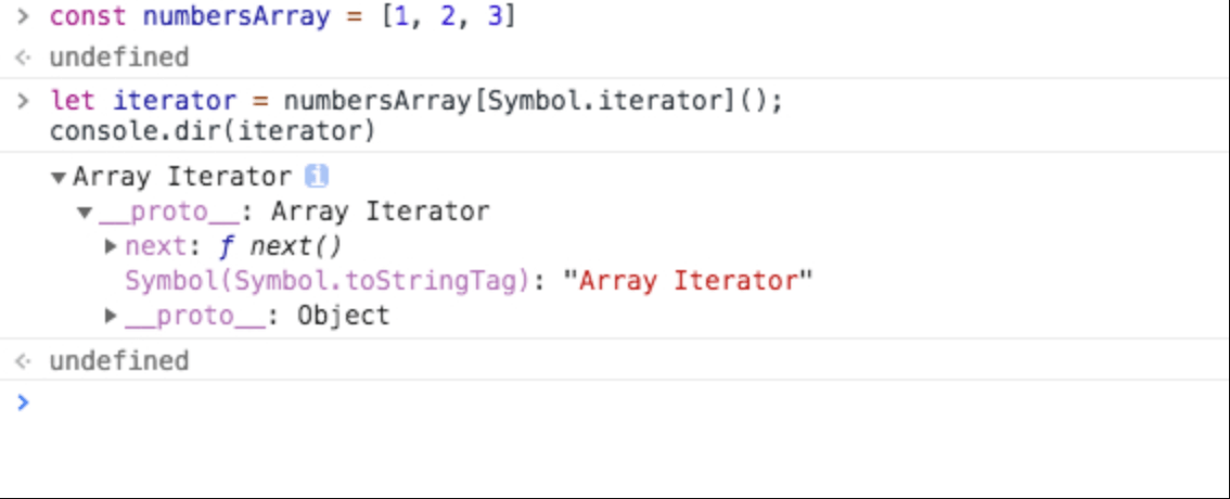 数组 (或者类数组对象: Strings , Maps , Sets , arguments ) 的原型中都实现了一个方法 Symbol.iterator ,问题来了,那么这个 Symbol.iterator 又有什么用呢? 拿出来试一下就知道了: