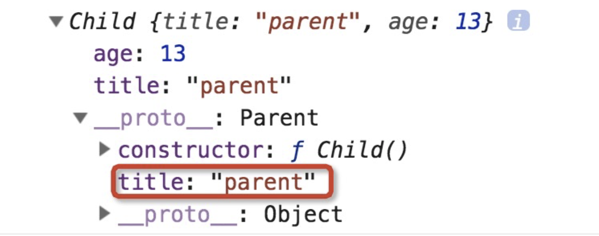 这样我们生成的 child 对象本身包含了他从 Parent 中继承来的 title 属性,但是同时 Child.prototype 同时也包含了所有 Parent 上的所有属性,造成内存的浪费: