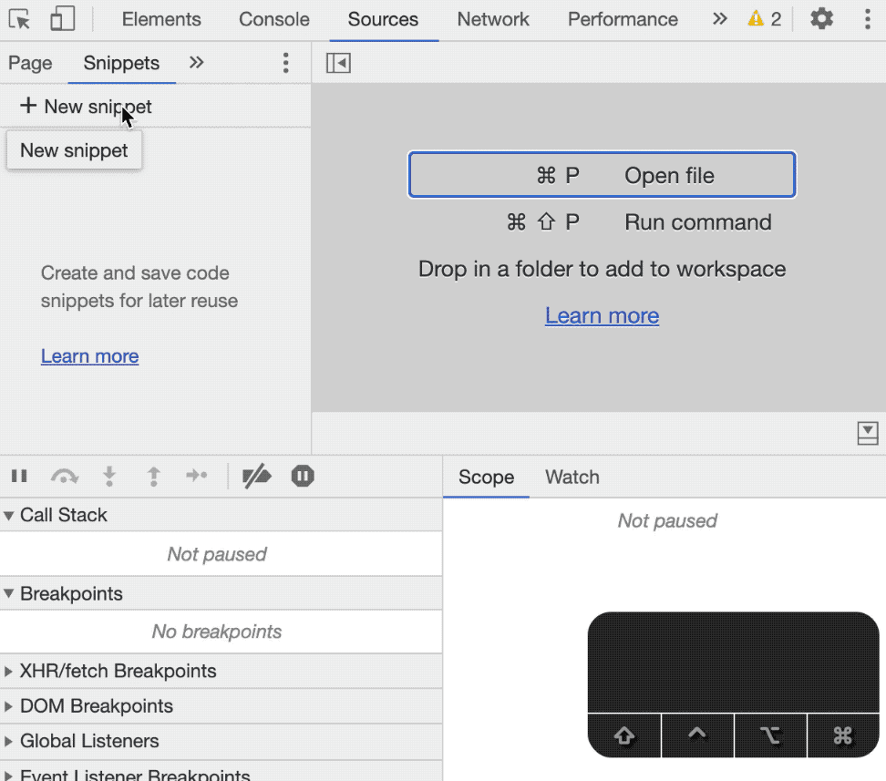 这就是 Snippets 的用武之地了:通过它可以存放 JavaScript 代码到 DevTools 中,方便下一次使用: