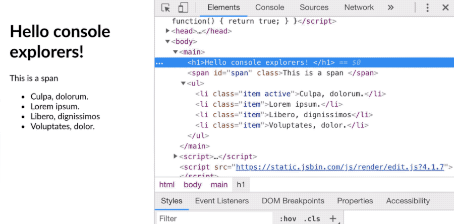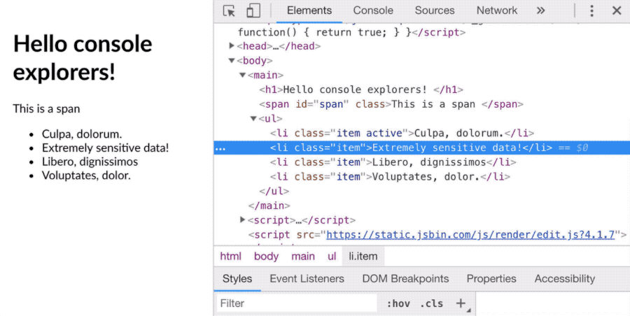 按一下 'h' 就可以隐藏你在元素面板中选择的元素。再次按下 ' h ' 可以使它出现。某些的时候这很有用:例如你想截图,但你想去掉里面的敏感信息。