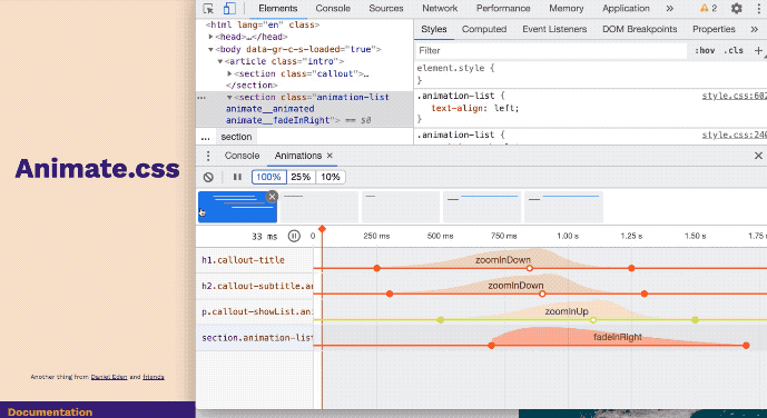 位于 Detail 面板左边的列表中会列出所有参与这个动画的 DOM 元素,并且在 element 面板和视窗中当前元素会被选中: