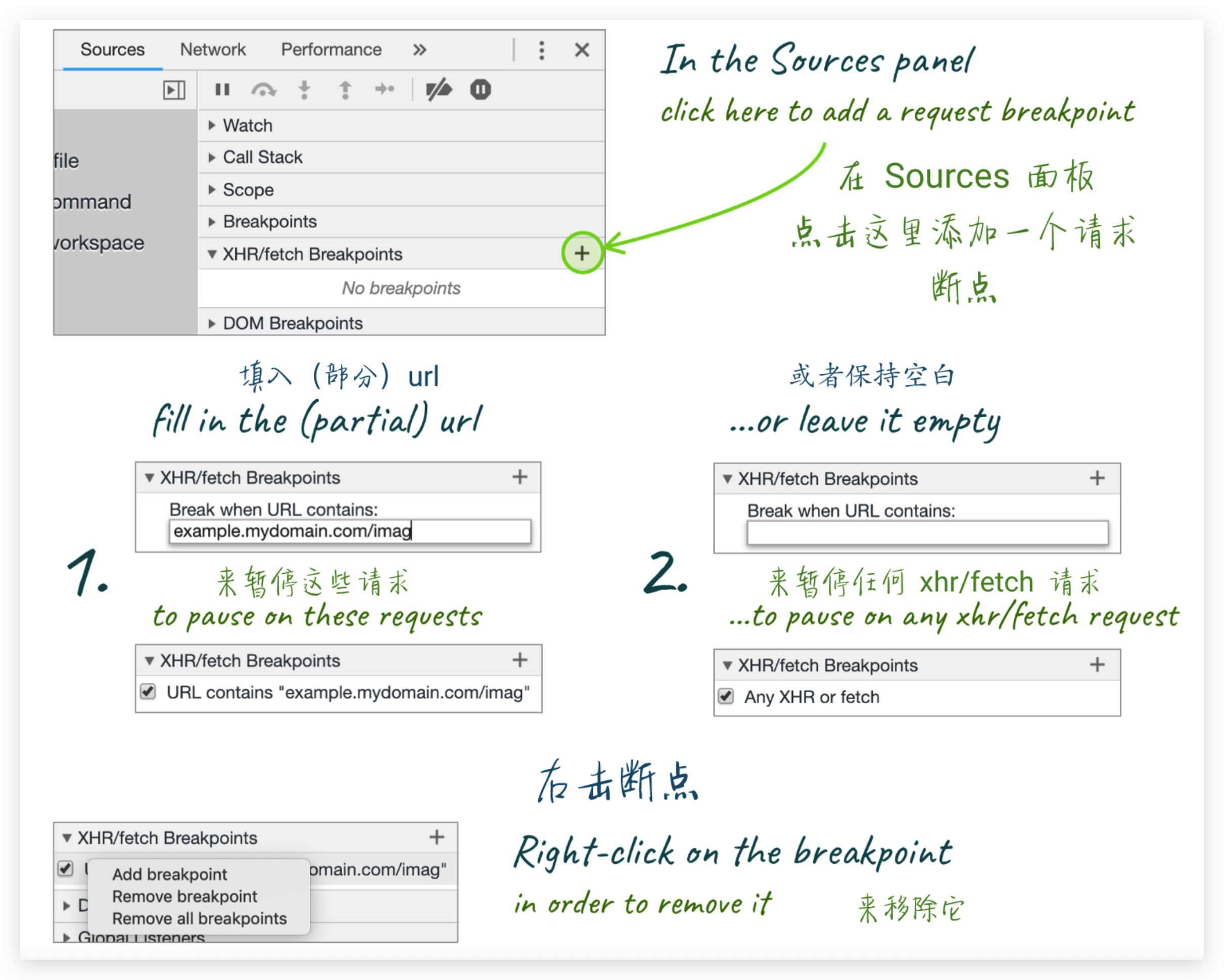 在某一特定时刻,你想要对已发送的 “ajax” 请求进行捕获怎么做呢? 可以使用 XHR/fetch breakpoint 。