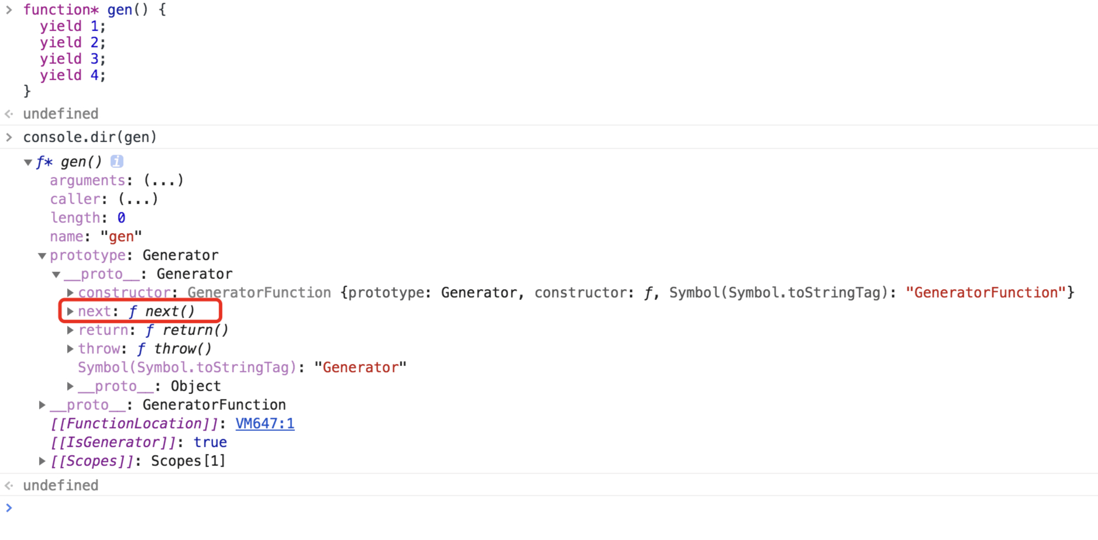这里发现了一个熟悉的函数, next() 方法,我们把 gen 实例化一下,执行一下它的 next() 来看看结果: