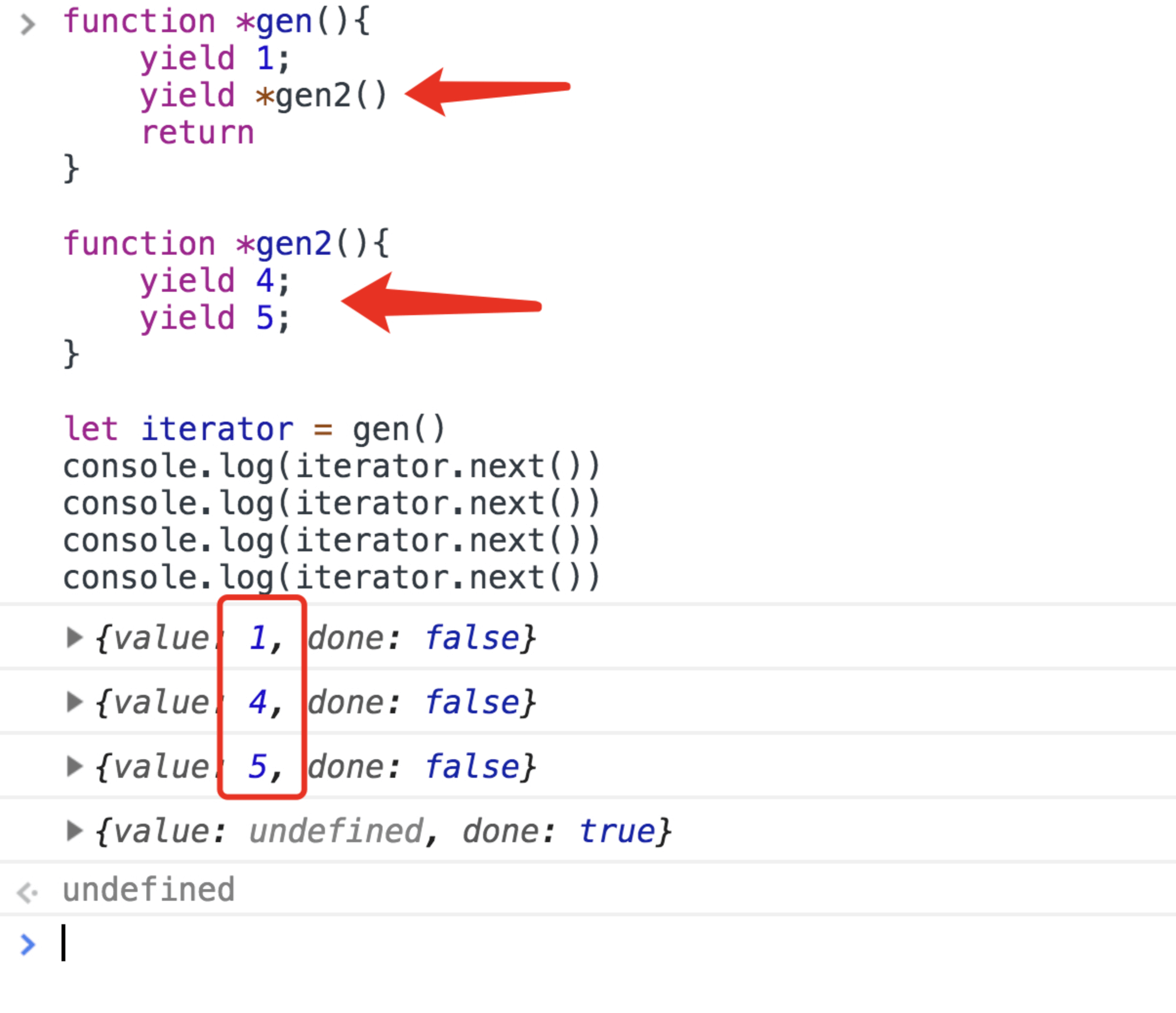 多说一句,针对 Generator 本身,还有一个有意思的特性, yield 后面可以跟上另一个 Generator 并且他们会按照次序执行: