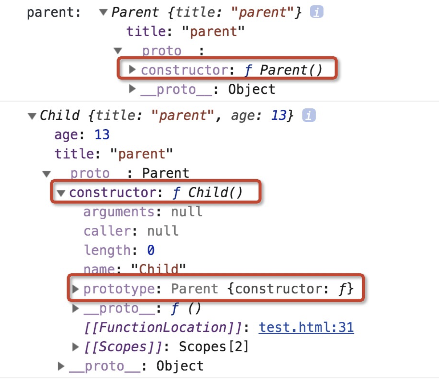 Child.prototype === parent 是因为我们在代码中中强行设置了, parent.constructor === Child() 是因为 parent 对象本身也有一个 constructor 属性,这个属性默认返回 parent.__proto__.constructor 所以之前是 Parent() 但是现在也被代码强制设置为了 Child()