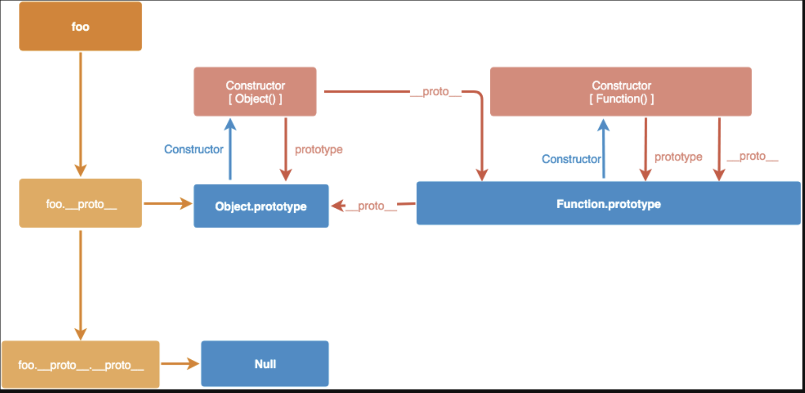 构造函数 Foo 可以通过 Foo.prototype 来访问原型,同时被构造出来的对象 foo 也可以通过 foo.__proto__ 来访问原型: